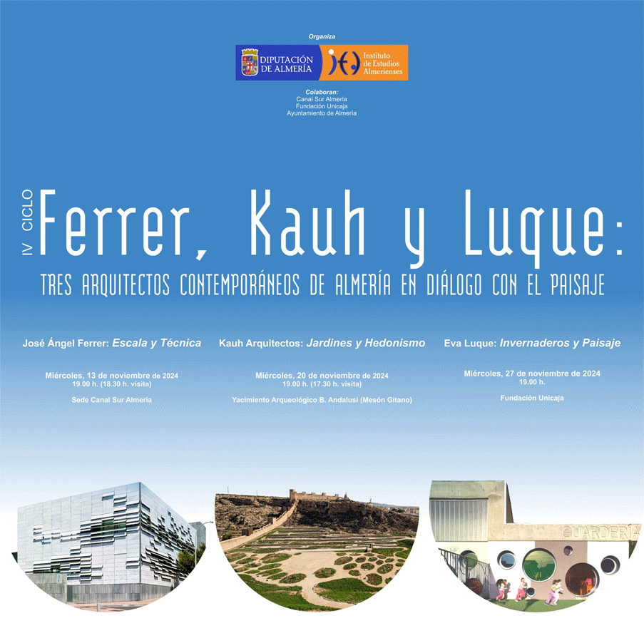 En este IV Ciclo se abordará la obra de tres arquitectos contemporáneos vinculados estrechamente con la intervención en el paisaje: José Ángel Ferrer, Kauh Arquitectos y Eva Luque. El ciclo se presenta como continuidad de los ciclos ya celebrados, en aquellas ocasiones, sobre arquitectos ya fallecidos que desarrollaron su obra durante el siglo XX en Almería: Trinidad, Langle y Góngora (2018) y Rull, Peña y Cassinello (2019); o del III Ciclo vinculado con arquitectos contemporáneos dedicados a la intervención en el patrimonio: Castillo, Blanes y De Torres (2021).